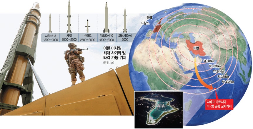 20일(현지 시간) 월스트리트저널(WSJ)은 이란 미사일 부대가 이날 본토에서 약 4000㎞ 떨어진 인도양 디에고가르시아 영국·미국 공동 군사기지에 중거리탄도미사일(IRBM) 2발을 쐈으나 목표물을 타격하지는 못했다고 전했다.하나는 비행 중 고장났고 다른 하나는 미 해군 구축함이 요격했다고 미 당국은 밝혔다.영국령 인도양의 외딴섬에 위치한 디에고가르시아는 미국이 폭격기와 핵잠수함,유도미사일 구축함을 배치한 전략적 기지다.