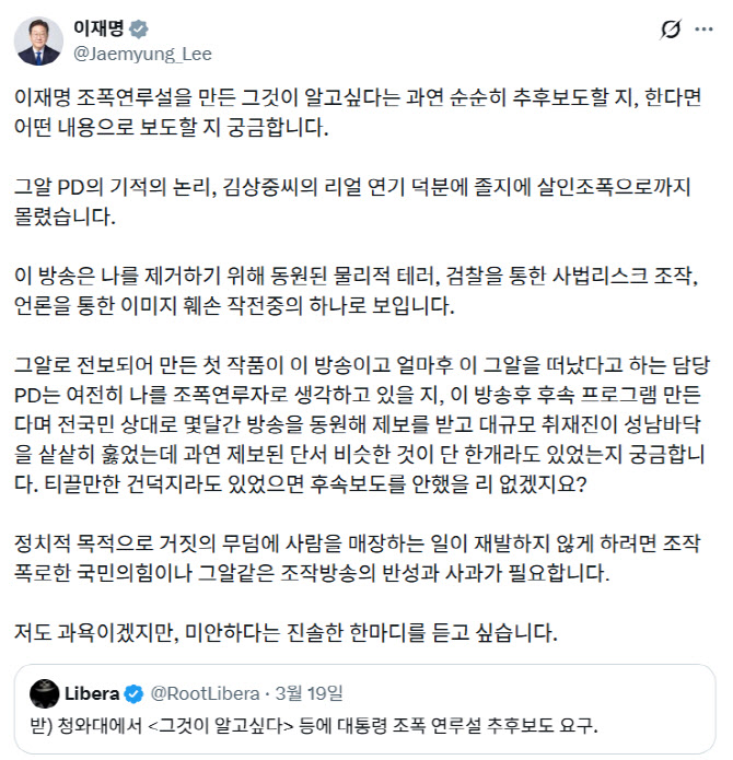 박충권 국민의힘 의원은 이재명 대통령이 SNS에 그알 관련 비판글을 여러차례 게시한 것에 대해 입장을 질의했다.